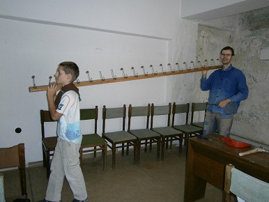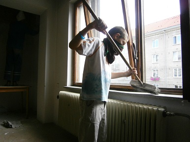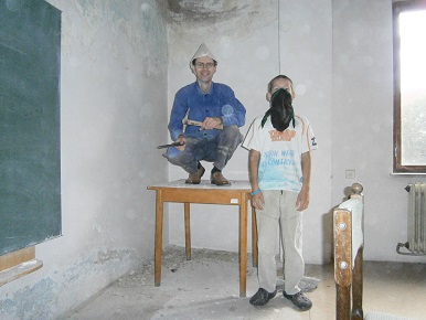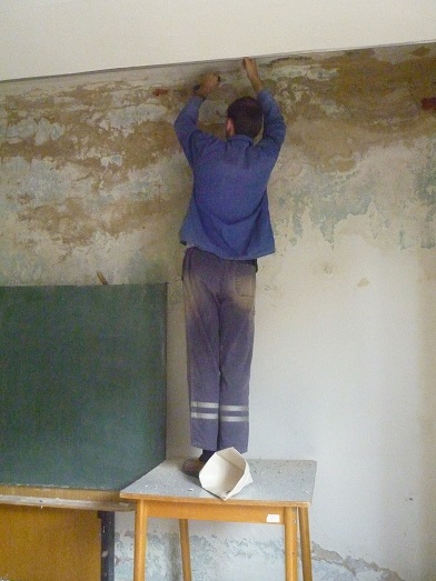 - šikovný Mauglí: - Ičko na stole špachtľou zoškrabúva starý náter pri strope: