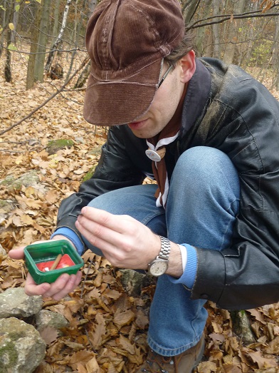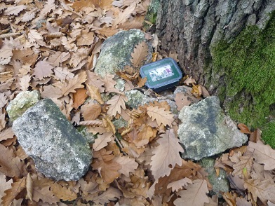 - ako prvú sme odlovili kešku „Dve borovice“: - druhá keška sa nachádzala v kamennej hromade: